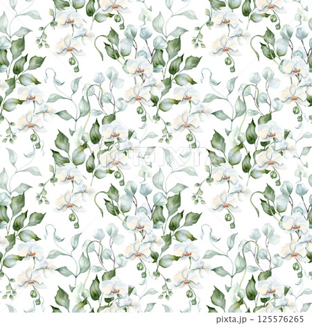 Seamless watercolor pattern with white orchids, eucalyptus, and holly leaves. Wavy branches and delicate floral bouquet in pastel shades hand drawn. Elegant botanical print for textiles, and wrapping.