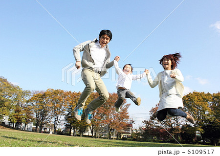 手をつなぎ笑顔でジャンプする3人家族 ファミリー イメージ