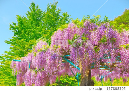 快晴の青空と満開の藤の花