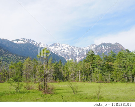 上高地の新緑と雪山が美しい爽やかな山岳風景