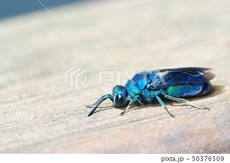 生き物 昆虫 ムツバセイボウ、金属光沢の虹色のハチ。ざらついた肌の粒々が一つづつ輝いています