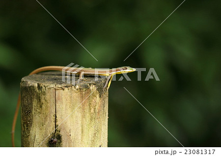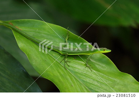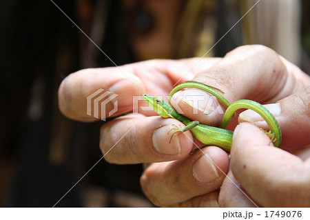 生き物 爬虫類 アオカナヘビ、沖縄諸島に住む日本固有種。メスの体は鮮やかな緑色