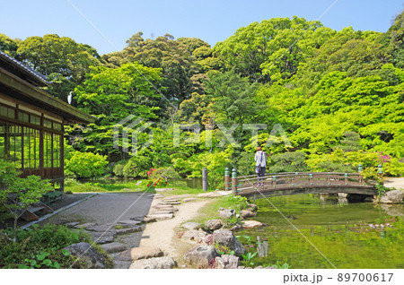 山口県下関市の廻遊式庭園長府庭園書院と橋を渡る人物