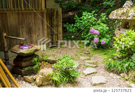 柳谷観音楊谷寺、水琴窟そばの紫陽花花手水「琴手水」