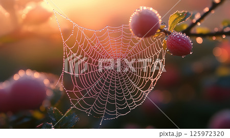 Spider web covered in morning dew drops glistening against sunrise with red berries and autumn leaves. Concept of natural beauty, fragility, and organic architecture