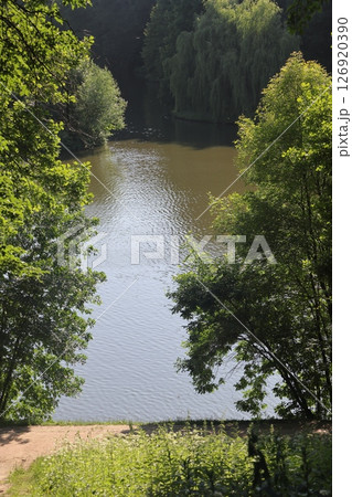 Beautiful colorful summer spring natural landscape with a lake in Park surrounded by green foliage
