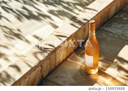 Sun-soaked moments captured in a serene image of a chilled wine bottle on rustic stone