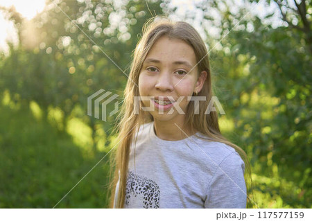 a portrait of a teenage girl with long blond hair in a sunlit garden
