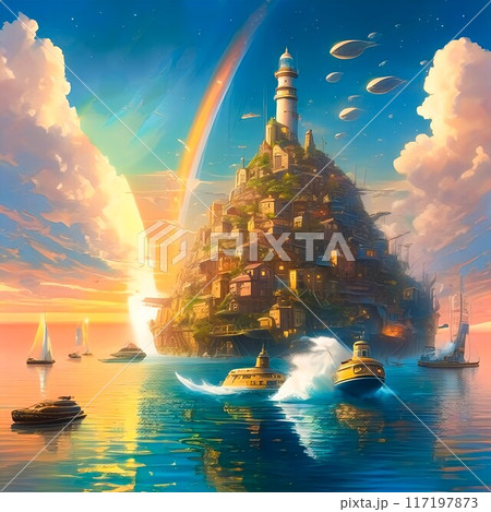 【イラスト素材】虹とともに帆船が行き交う夢の島へ/井上軟太郎