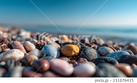 A low-angle, close-up shot of wet, multi-colored pebbles on a beach, stretching toward a blue sea and sky under bright sunlight.