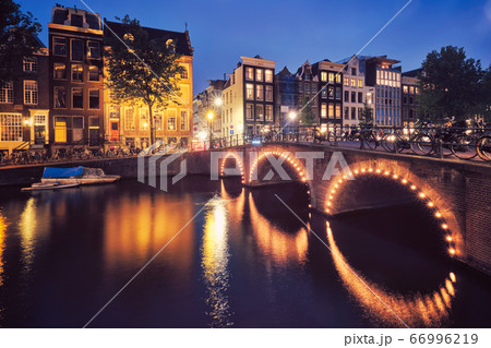 Amterdam canal, bridge and medieval houses in the evening