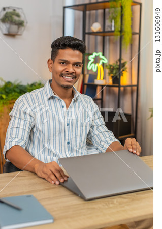 Indian man ends work day closes laptop smiles with satisfaction and feels job done and calm relief