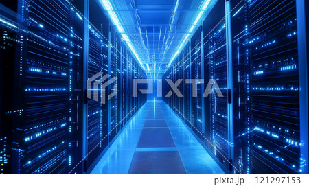 冷たい青光に浮かぶAIサーバー室の配線風景