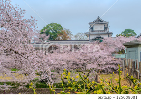 鮮やかなコントラスト - 金沢城、桜、そして黄色の花