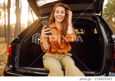 Beautiful woman in the trunk of a car enjoying nature in the forest. Adventure, technology concept.