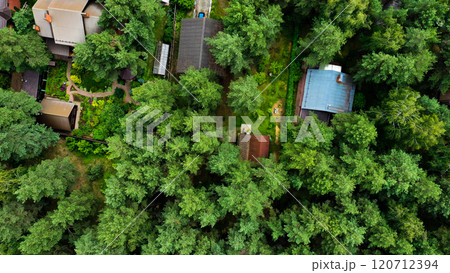 Aerial view of lush green forest surrounding charming homes in a serene countryside setting during the day