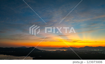 Aerial view of Panoramic Sunset Over Coastal Cityscape of Phuket