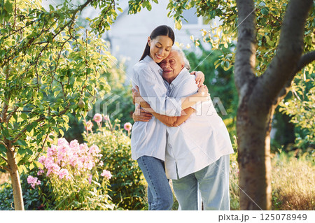 Time for a hugs. Young woman is with her senior mother is in the garden