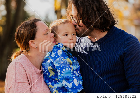 On a sunny autumn day in the park, a mother and father lovingly embrace their young son, sharing moments of laughter and joy as they play together
