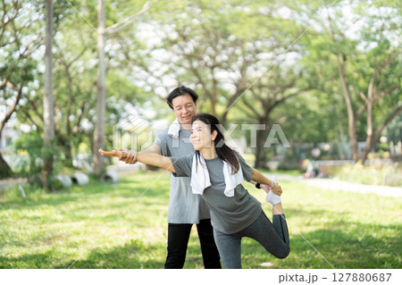 Couple enjoying playful yoga moments in the park