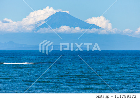 御前崎海岸から見た駿河湾に浮かぶ富士山と波