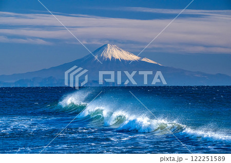 御前崎海岸から見た駿河湾に浮かぶ富士山と荒波