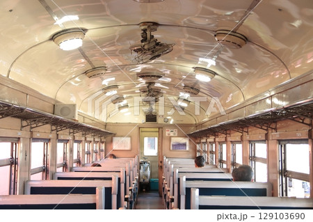 レトロな内装の国鉄オハ35系旧型客車の内装(大井川鉄道保存車両)