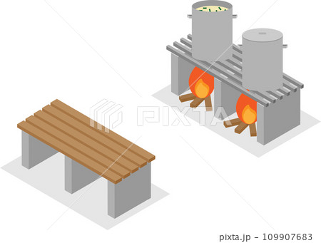 アイソメトリックな防災ベンチで炊き出しを行っているイメージ素材