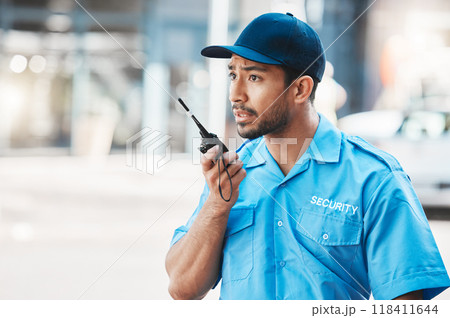 Security guard, communication and officer use a walkie talkie or radio for an emergency or criminal investigation. Protection, safety and police talking in a law enforcement service office for crime