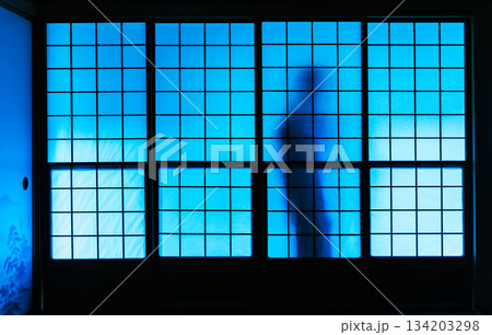 障子の向こうに佇む2人の幽霊のシルエット、青く不気味な和室の夜