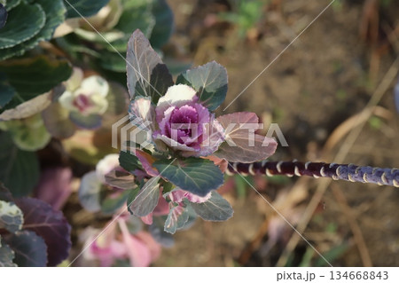 冬の公園に咲く紫色の葉牡丹の葉の様子