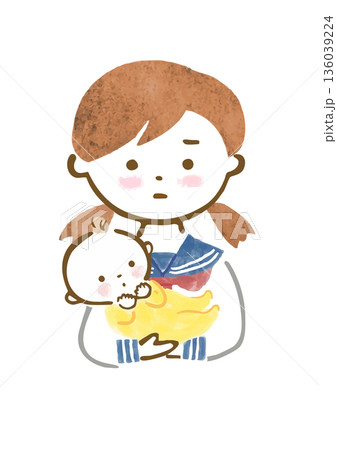 厳しい表情で赤ちゃんを抱っこするセーラー服を着た女の子のイラスト