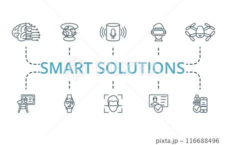 Smart Solutions icon set. Monochrome simple Smart Solutions icon collection. Artificial, Hologram, Voice Assistant, Virtual Glasses, Air Drone, Augmented Reality, Smart Watch, Face Recognition