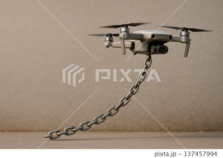 Drone on a chain in flight. Space for text.