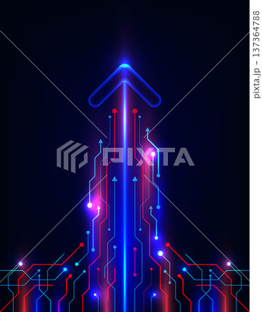 Digital growth technology background with glowing blue neon arrow rising red and blue electronic circuit board pattern for innovation and corporate success