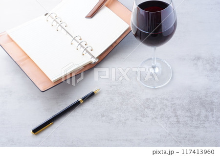 赤ワインを飲みながら、リング式のシステム手帳に日記をつけているイメージ写真
