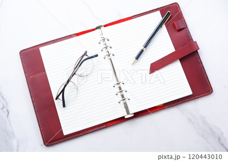 茶色の革のシステム手帳と金縁の眼鏡、ペンで、デスクワークをしているイメージ