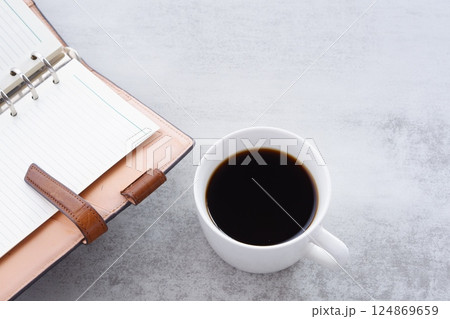 淹れたてのコーヒーを飲みながら、リング式のシステム手帳を開いてデスクワークをしているイメージ