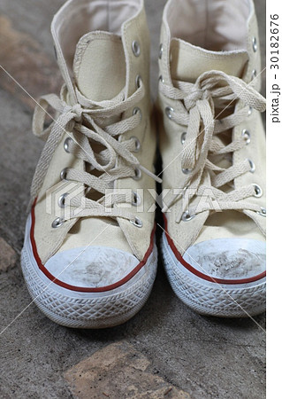 履き古したハイカットスニーカー ベージュのキャンバスシューズ