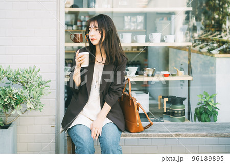 屋外でコーヒーを飲む女性