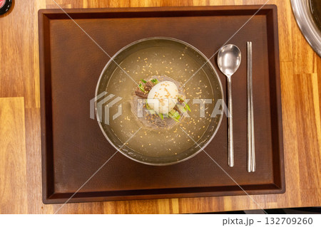Authentic Pyongyang naengmyeon with chewy buckwheat noodles in cold, clear broth, offering a refreshing and delicate flavor. Perfect for traditional Korean cuisine menus and summer dishes.