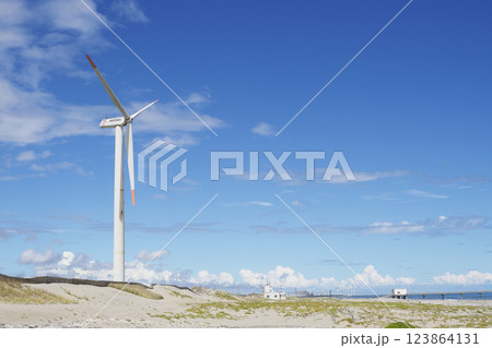 青空と海岸の風力発電の風車。茨城県神栖市須田浜海岸の波崎ウインドファーム。