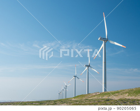 青空と風力発電の風車。茨城県神栖市須田浜海岸の波崎ウインドファーム。
