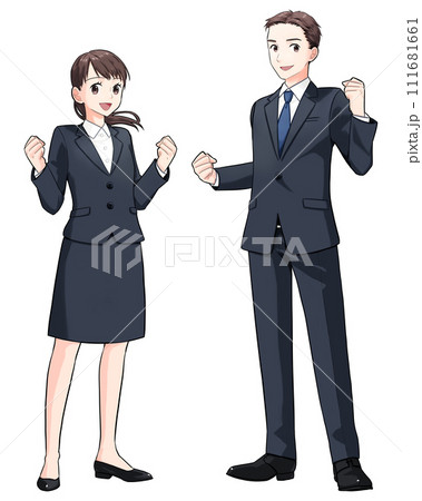 ガッツポーズするスーツ姿の若い男女