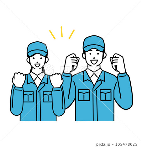 ガッツポーズをする作業服を着た男女の作業員のシンプルなイラスト