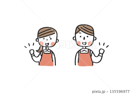 ガッツポーズをするエプロンにバンダナ姿の男女