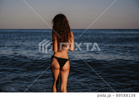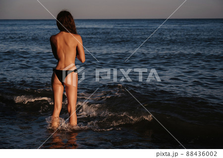 young topless girl with a sexy ass is sunbathing on the beach by the sea