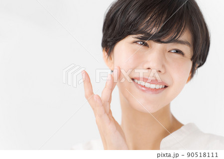 頬に手をあてる肌の綺麗な日本人女性モデルのポートレート(美容・艶・透明感)