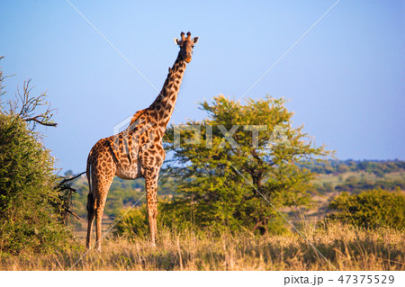 Giraffe on savanna. Safari in Serengeti, Tanzania, Africa