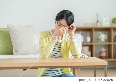 疲れ目の女性 眼精疲労に悩む女性 片頭痛 悩む女性 不安を抱える女性 何かを考える女性